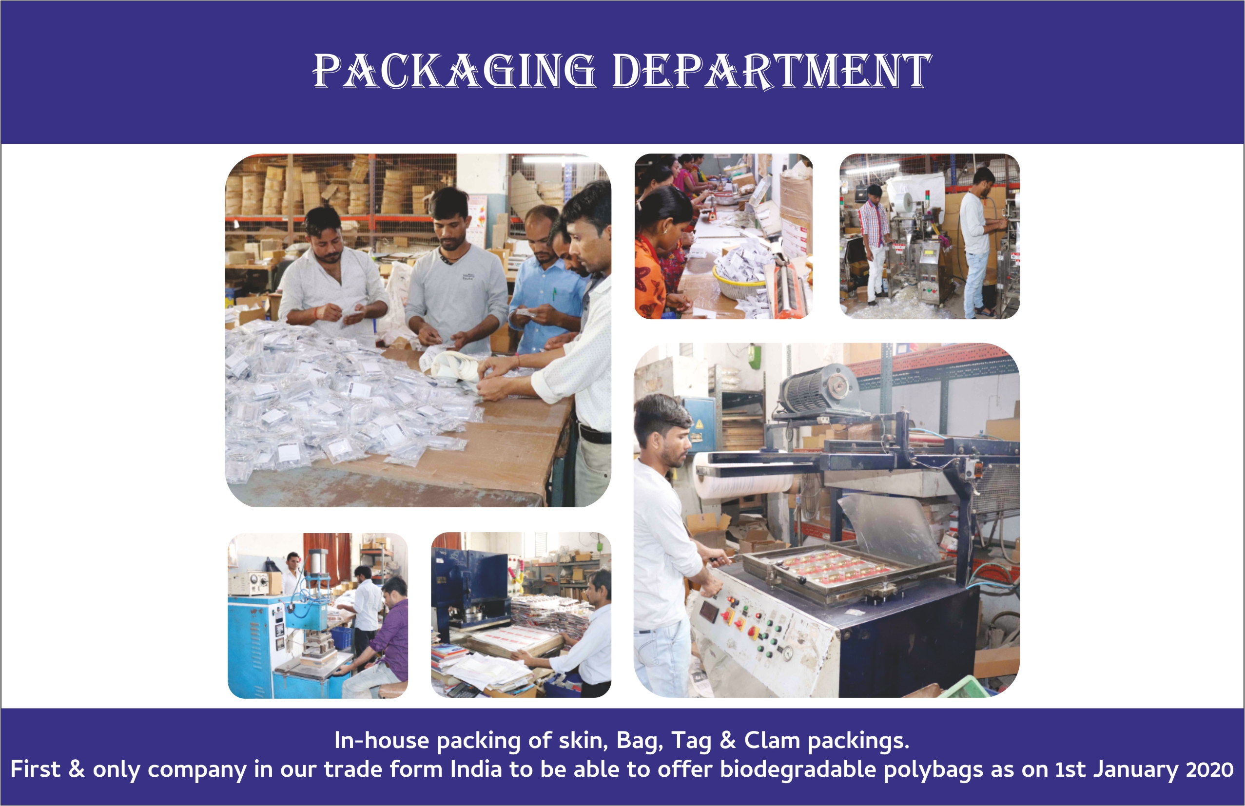 - - In-house skin, blister, printed polybags, customized packing facilities. First & only company in in our trade from India to be able to offer biodegradable polybags as on 1st January 2020.