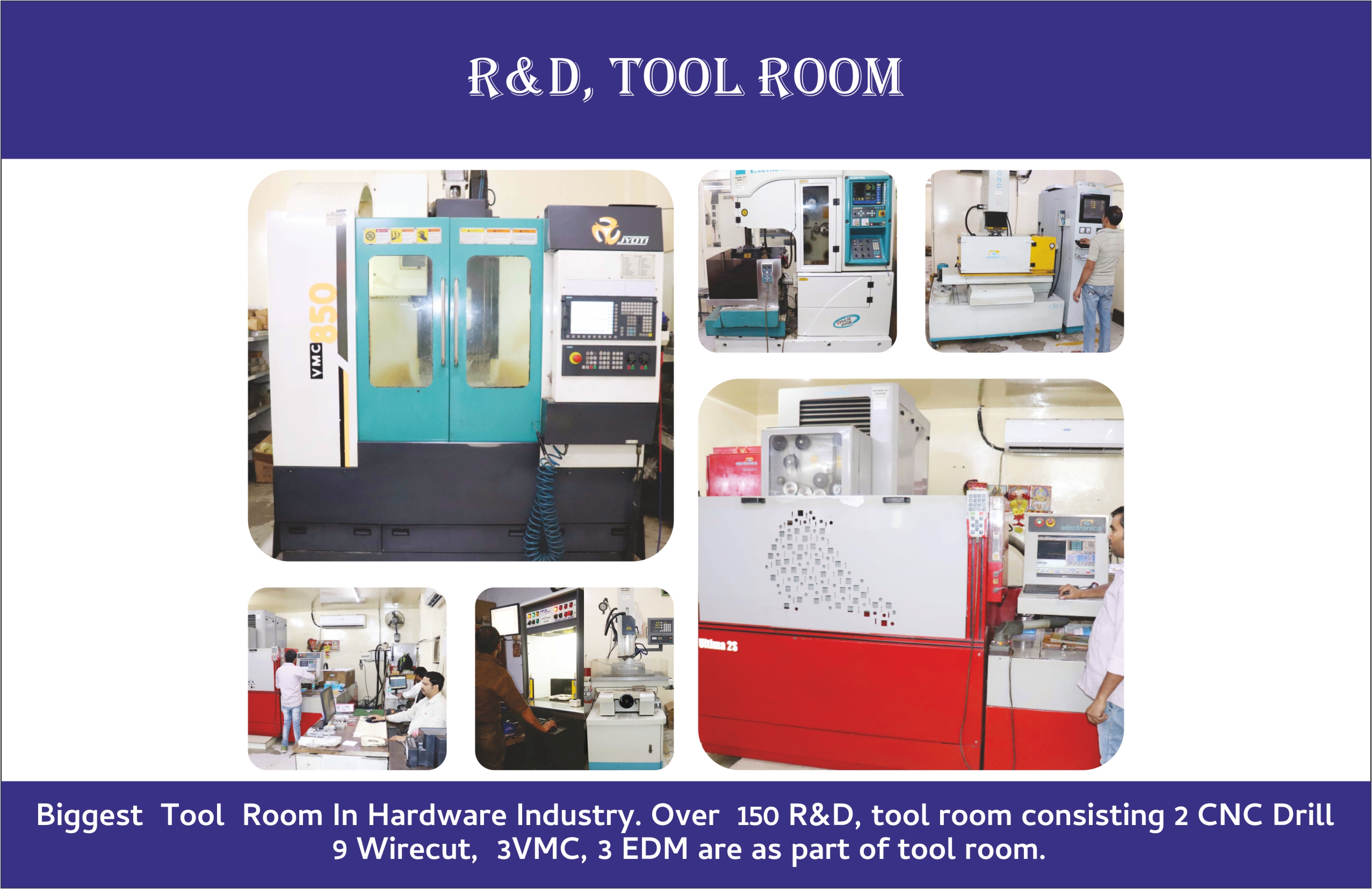 - - In-house biggest Tool Room in hardware industry. Tool room consisting - 2 CNC Drill, 9 Wirecut, 3 VMC, 3 EDM machines and many more conventional machines are as part of tool room.